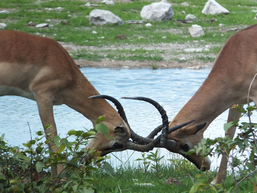 Next day (Christmas Day) we were off early to Etosha, one of southern Africa’s biggest national parks. This is rainy season (despite all the river beds being bone dry and us having seen no rain) which is the worst time of year for animal spotting, as they have plenty of water all around, they can avoid visiting the water holes where they congregate in winter. Despite this we were both excited at the prospect of more wildlife. We had to look hard for it and cover a lot of ground, but Etosha didn’t disappoint. We saw two different groups of Lions (one rather randy couple and one couple with a cub), two more elephants, a black rhino, a spotted hyena, tons of giraffe, oryx, kudu, springbok, impala, and even a tortoise! We also saw quite a few different birds, including a Marabou stork, various eagles and a vulture. It was great to see all these creatures in their natural environment, but also not scared of our car. We had a particularly lovely experience with the first elephant, watching it walking along beside our car, then taking a long mud-bath.